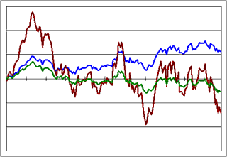 Это график изменения количества денег у трёх воображаемых игроков, которые в течение года побывали в совершенно одинаковых ситуациях. Синий игрок весь год бесстрастно как машинка для печатания денег выполнял свои (а) и (б). Красный играл более увлеченно, много выигрывал, в том числе благодаря рискованным ставкам, которых избегал синий игрок, но по этой же причине и из-за эмоций красный больше терял на неудачных ситуациях. зелёный действовал почти как синий, но выигрывал чуть меньше в удачных ситуациях, кредо у него такое - не брать лишнего. У всех троих, включая синего игрока, было несколько периодов затяжных неудач, длившихся дольше месяца, когда количество их денег только уменьшалось. Однако потери красного игрока в эти неудачные периоды намного более значительны.
